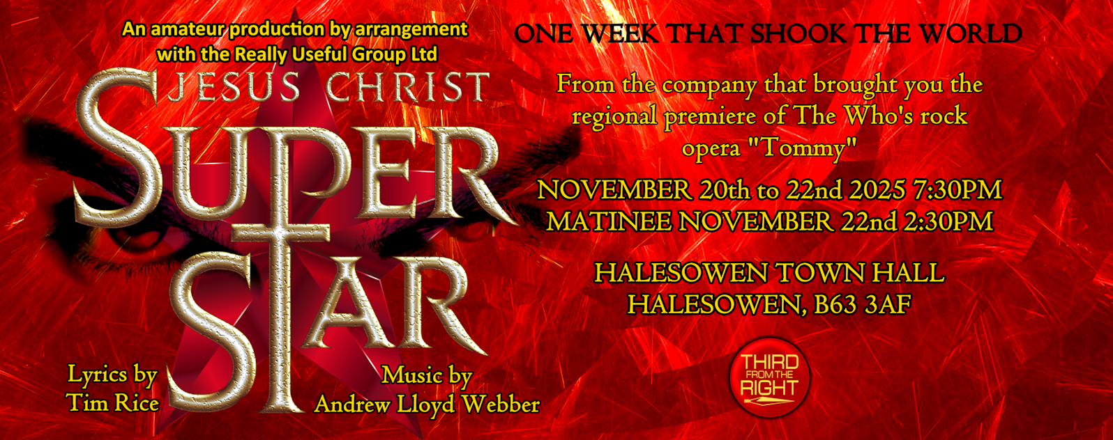 Third From The Right Productions Ltd is an amateur theatre company based in the UK in the Black Country in the West Midlands in the heart of England. We were formed with the sole aim of bringing high quality, lesser-known musical theatre and dramatic works to a wider audience. We are proud to have produced the regional premiere productions of Shout!, Disenchanted!, Soho Cinders, The Who's Tommy and Women on the Verge of a Nervous Breakdown.